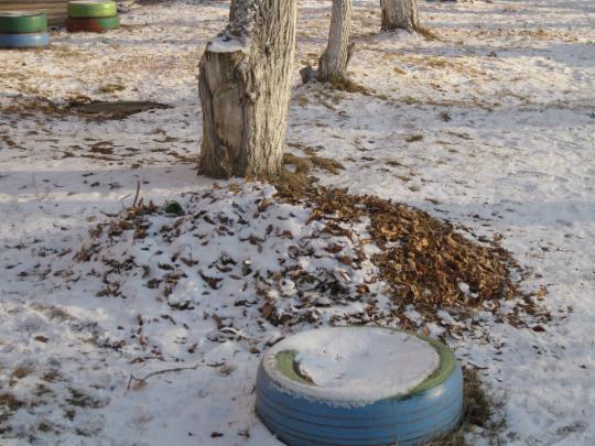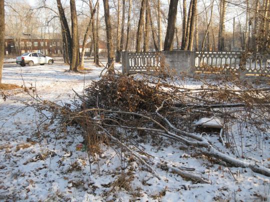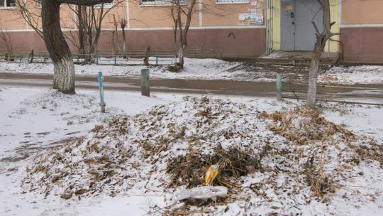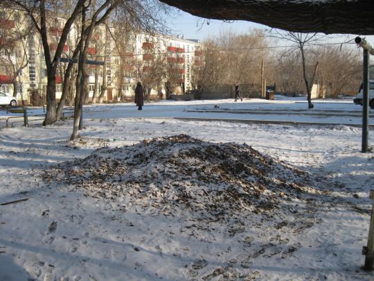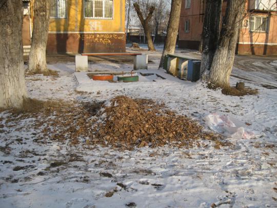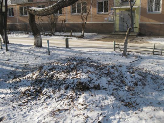 Во многих дворах до сих пор лежат обрезанные ветви деревьев, кучи осенней листвы вместе с собранными бутылками, банками и прочим. Сейчас кучи и кучки заносит снегом и, вероятно, коммунальщики ждут момента, когда их полностью скроет снег, а они смогут бодро отчитаться о «проделанной» работе.